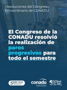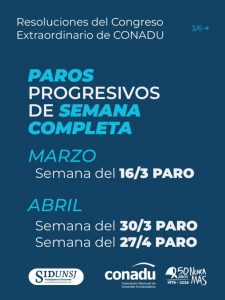 En el día de ayer el Congreso de CONADU resolvió la profundización del plan de lucha con la ratificación del paro de una semana que comienza el lunes 16 de marzo, y un paro de semana completa en las semanas que comienzan el lunes 30 de marzo y el lunes 27 de abril. Se facultó al Plenario para realizar un seguimiento de las acciones para darle continuidad al plan acordado para todo el semestre, EN EL MARCO DE LA PROGRESIVIDAD DE LAS MEDIDAS.