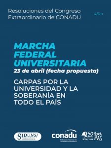 De forma unánime se acordó la realización de una MARCHA FEDERAL UNIVERSITARIA con fecha propuesta del 23 de abril a coordinar con el Frente Sindical Universitario y la comunidad universitaria en general. El Congreso evaluó la importancia de retomar el contacto entre estudiantes y docentes para que esta nueva marcha sea la expresión masiva en las calles de un pueblo que defiende la universidad pública.