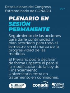 Se ratificó lo actuado por el Plenario de Secretarios y Secretarias Generales que continúa en SESIÓN PERMANENTE el cual está facultado a llamar a paro de manera urgente en caso de que comience el tratamiento en comisiones de la modificación de la Ley de Financiamiento Universitario que pretende el gobierno de Milei.